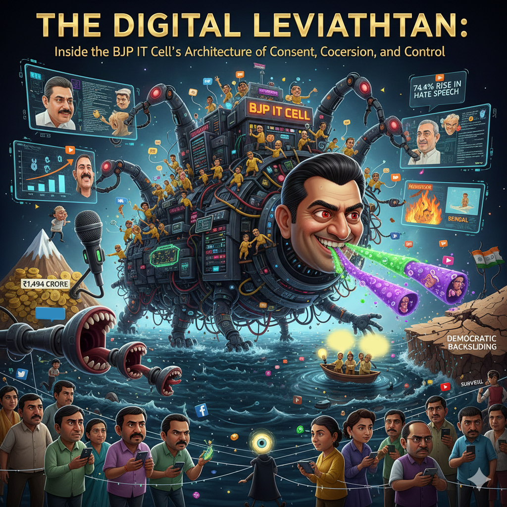 In December 2025, India’s digital political landscape is dominated by the Bharatiya Janata Party’s (BJP) highly professionalized IT Cell, currently led by Amit Malviya, which functions as a vast, hierarchical apparatus blending centralized strategy, AI-driven tools, paid operatives, and massive volunteer networks to orchestrate continuous propaganda, narrative control, and disinformation campaigns across platforms like WhatsApp, X, YouTube, and Facebook. Widely criticized for systematically disseminating misinformation, deepfakes, clipped videos, communal hate speech (particularly anti-Muslim), and coordinated trolling that incites offline violence and vigilantism—while rarely retracting debunked claims—the IT Cell is accused of manufacturing consent, suppressing dissent through intimidation and surveillance-linked tools, and diverting public attention from economic precarity, unemployment, and governance failures via spectacle-driven “statue-temple nationalism” and pseudoscientific Hindutva myths. Operating symbiotically with “Godi media” owned by aligned corporates (Adani, Ambani), fueled by opaque funding and asymmetric ad spends, and enabled by regulatory gaps in AI oversight, data protection exemptions, and platform passivity, this “digital Leviathan” erodes epistemic trust, polarizes society, chills free expression, and contributes to democratic backsliding, even as independent fact-checkers (e.g., Alt News), civil society, and media literacy initiatives offer resilient counter-efforts against the routinization of information warfare in India’s platform-mediated public sphere.